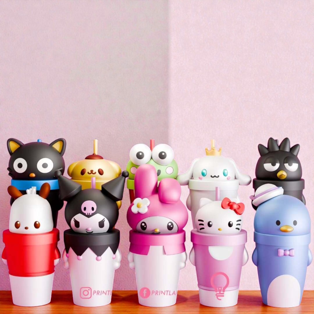 Vaso temático inspirado en los personajes más populares de Sanrio. Diseño 3D con relieve y tapa con sorbete reutilizable.